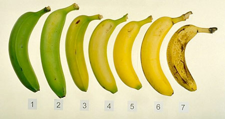 Chuối: Chuối chín “sạch”, không ngâm tẩm hóa chất có thể phân biệt bằng mắt thường nhờ những đặc điểm: Trái chuối căng tròn (khi chuối già, chín vỏ thường căng, các góc không còn gồ lên như chuối non). Màu vàng của vỏ chuối không tươi roi rói mà vàng sậm, xỉn hơn, chuối có mùi thơm tự nhiên. Trên lớp vỏ vàng sậm có những chấm đen, nâu như tàn nhang (chuối trứng cuốc). Nếu chuối chín kỹ, có thể có những vệt thâm đen sẫm màu.