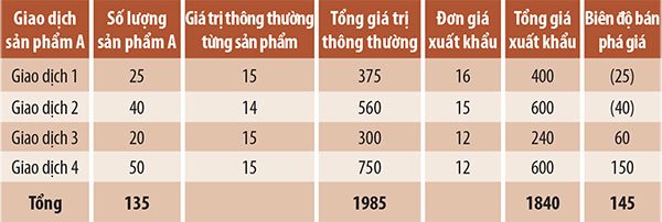 Nếu tính theo cách thông thường, biên độ bán phá giá của sản phẩm A là [(1985-1840)/1840]x100% = 7,88%. Nếu áp dụng phương pháp zeroing, các giá trị âm là (25) và (40) đổi thành không (0), biên độ mới sẽ là [(60+150)/1840]x100% = 11,41%. Rõ ràng kết quả của việc sử dụng phương pháp zeroing cao hơn nhiều so với kết quả khi không sử dụng phương pháp zeroing.