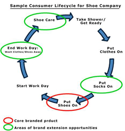Như trong hình vẽ mô tả, công ty sản xuất giày đã tận dụng được giai đoạn “Put shoes on” trong chu kỳ tiêu dùng qua việc tạo ra được một loại giầy và có được một cơ sở khách hàng nhất định cho sản phẩm đó. Để dựng nên được một môi trường sinh thái cho thương hiệu, hãy chú ý đến tất cả các bước trong chu kỳ và phải nhận thức được các phương thức nhằm hỗ trợ khách hàng trong từng giai đoạn một.