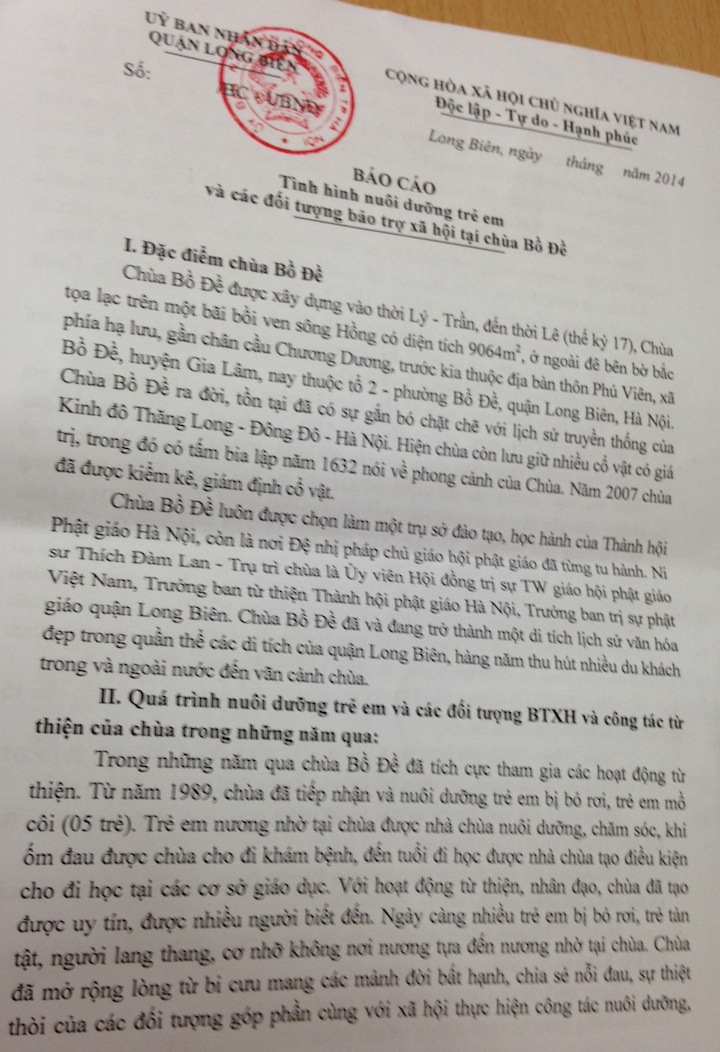 Ngày 19/8, Đoàn kiểm tra liên ngành thuộc UBND TP.Hà Nội và UBND quận Long Biên đã có kết luận kiểm tra hoạt động quản lý, nuôi dưỡng trẻ em và các đối tượng bảo trợ xã hội tại chùa Bồ Đề (phường Bồ Đề, quận Long Biên, TP Hà Nội) được tiến hành trong 3 ngày (5,6 và 7/8) vừa qua.