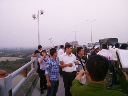 Nguyễn Mạnh Tường bị áp giải lên cầu Thanh Trì để thực nghiệm lại quá trình ném xác bệnh nhân phi tang (Ảnh chụp chiều 22/10/2013)
