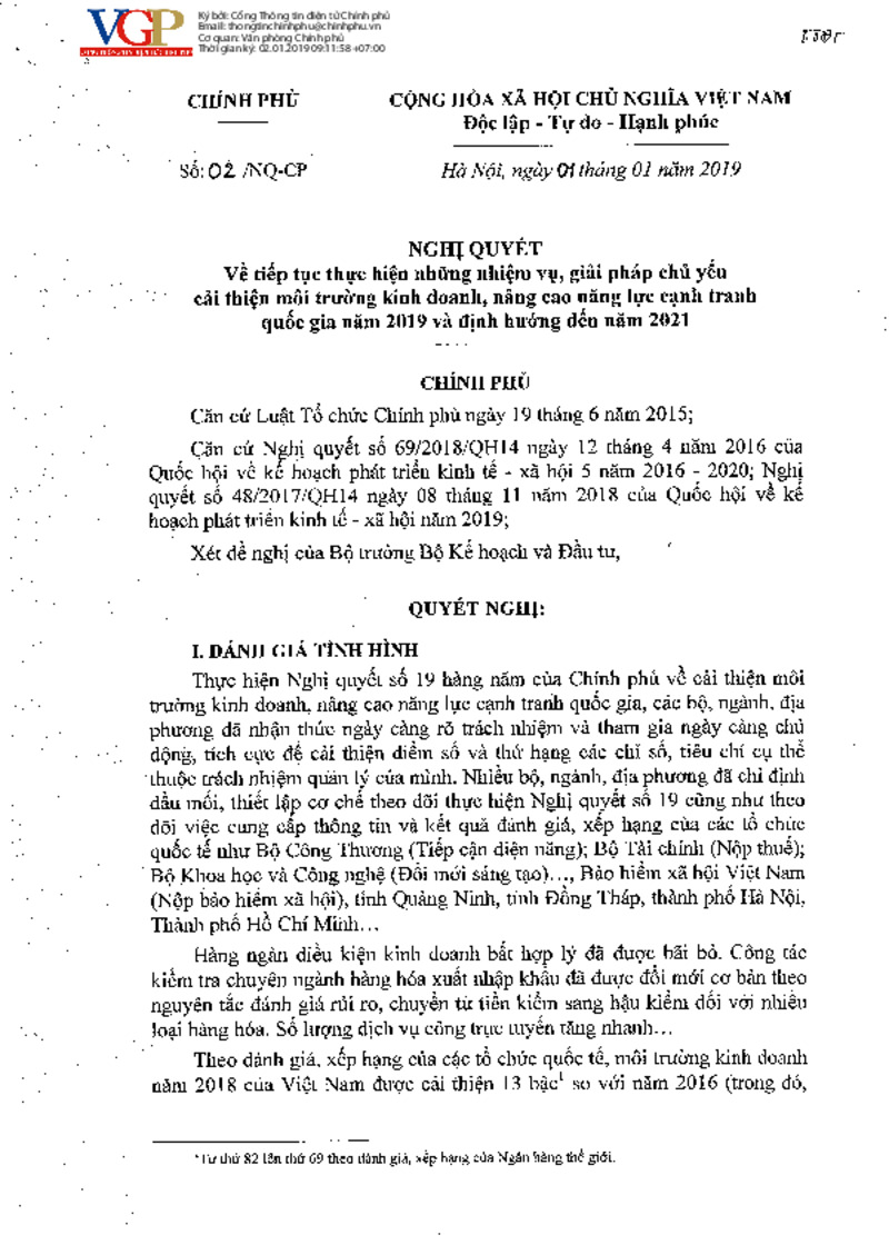 Về tiếp tục thực hiện những nhiệm vụ, giải pháp chủ yếu cải thiện môi trường kinh doanh, nâng cao năng lực cạnh tranh quốc gia năm 2019 và định hướng đến năm 2021