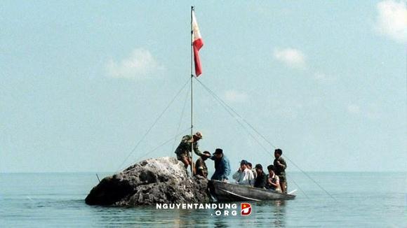Người Philippines cắm quốc kỳ ở bãi cạn Scarborough, bị Trung Quốc dùng vũ lực chiếm đóng từ năm 2012 Ảnh: Phil Star