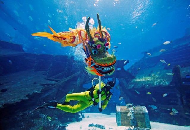 “Vũ điệu” múa rồng dưới nước trong lễ hội đón năm mới tại thủy cung Shipwreck Habitat ở đảo Sentosa , Singapore - Ảnh: Edgar Su/REUTERS