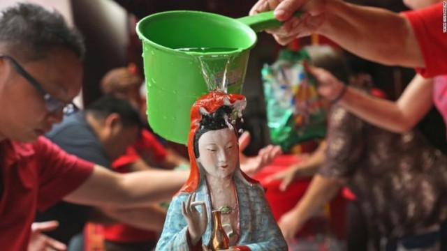 Bức tượng Phật tại một ngôi đền được rửa sạch bụi tại thủ đô Jakarta, Indonesia. Viếng chùa thỉnh nhang đầu năm mới là một phong tục truyền thống của người châu Á - Ảnh: CNN