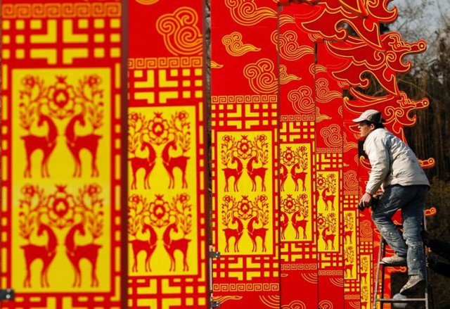 Công nhân trang trí Tết tại khu vực công viên Taoranting, Bắc Kinh, Trung Quốc - Ảnh: Kim Kyung-Hoon/REUTERS