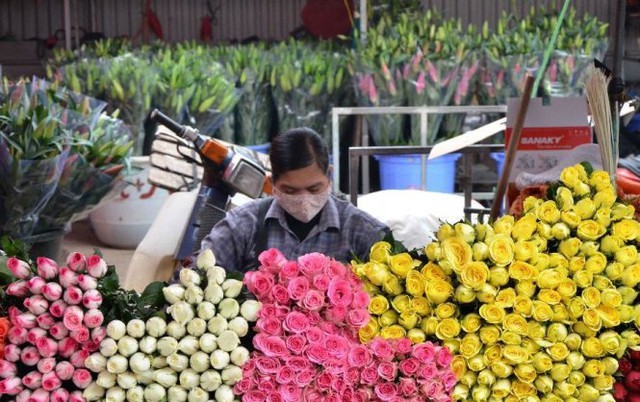 Một sạp hoa với đủ loại hoa nhiều sắc màu được bán tại chợ hoa Quảng Bá, Hà Nội - Ảnh: Tân Hoa Xã