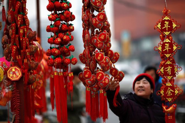Rực đỏ đồ trang trí Tết tại chợ Bắc Kinh - Ảnh: Kim Kyung-Hoon/REUTERS