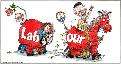 | Công Đảng chia rẽ sau khi Jeremy Corbyn được bầu làm Chủ tịch Đảng - Biếm họa của David Simonds, Guardian |