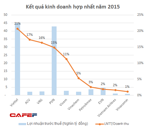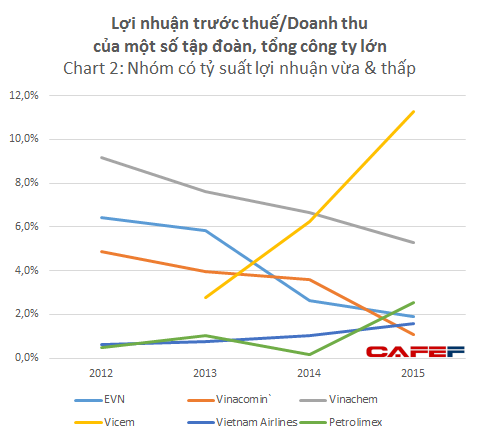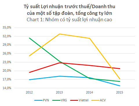 Số liệu do CafeF thống kê cho thấy tỷ suất lợi nhuận trên doanh thu của nhiều doanh nghiệp lớn đã giảm liên tục trong 2-3 năm gần đây như Tập đoàn Cao su (VRG), Tập đoàn Dầu khí (PVN), Tổng Công ty Cảng hàng không (ACV), Tập đoàn Hóa chất (Vinachem), Tập đoàn Điện lực (EVN), Tập đoàn Than khoáng sản (Vinacomin).