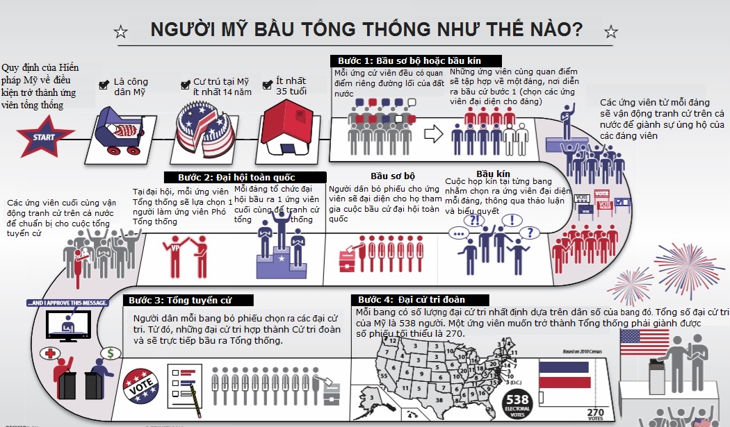 Bầu cử Tổng thống Mỹ là một quá trình khá phức tạp và trải qua nhiều giai đoạn căng thẳng kéo dài đến 12 tháng.