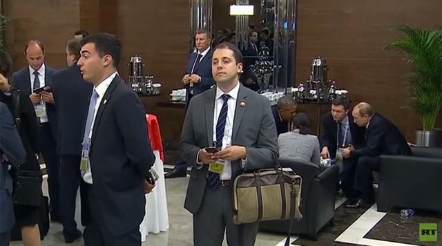 Người đàn ông bí ẩn đứng gần cuộc nói chuyện giữa Obama và Putin (Nguồn: RT)
