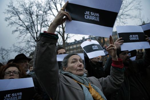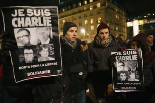 Người dân cầm băng-rôn trên tay với hình ảnh của nạn nhân mà đọc "Tôi là Charlie", để vinh danh các nạn nhân ở phía trước cổng Brandenburg gần sứ quán Pháp tại Pariser Platz ở Berlin ngày 07 tháng 1 năm 2015.