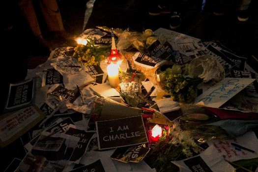 Đốt nến và hoa còn lại trên đầu trang của một đống poster có ghi 'Tôi là Charlie' bằng tiếng Pháp và tiếng Anh đặt ở cuối một buổi cầu nguyện của người dân, trong đó có nhiều người là người Pháp.