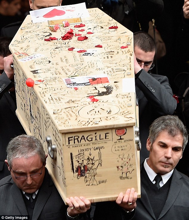 Lễ tang của họa sĩ Bernard Verlhac, một trong những nạn nhân của vụ thảm sát ở tòa báo Charlie Hebdo, đã được tổ chức ngày hôm qua, 15/1. Các đồng nghiệp đã vẽ những bức tranh biếm họa độc đáo lên trên quan tài để vĩnh biệt ông.