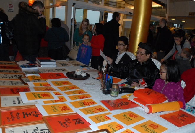 Ban tổ chức còn bố trí nơi viết thư pháp bằng nhiều thứ tiếng của kỹ sư Nguyễn Quyết Tiến và được đông đảo người tham dự xếp hàng xin chữ.