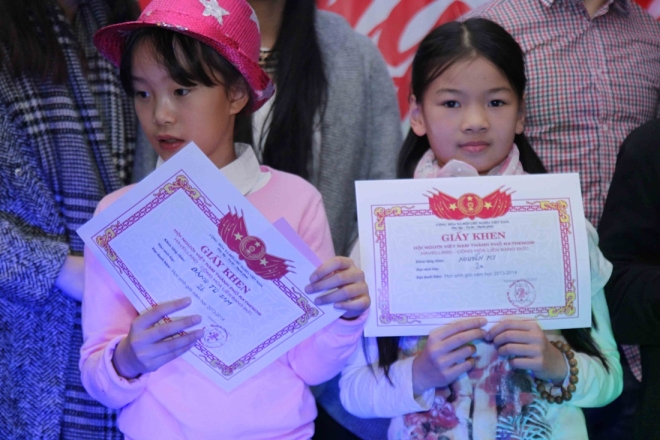 Các cháu học sinh đạt thành tích học tập cao được tặng bằng khen. Trong ảnh là cháu Đặng Tú Sam và cháu Nguyễn My, học sinh lớp 2, có điểm tổng kết trên 9 điểm.