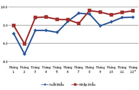 Nhìn lại trong 12 tháng qua, về cơ bản kim ngạch xuất, nhập khẩu không có tháng nào quá đuối, trừ tháng 2 do ảnh hưởng của Tết Nguyên đán.