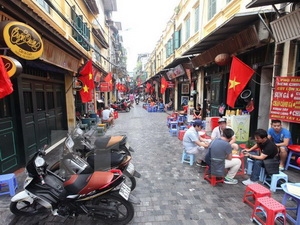 Phố Tạ Hiện rực rỡ cờ hoa chào mừng kỷ niệm 70 năm Cách mạng Tháng Tám và Quốc khánh 2/9. (Ảnh: Anh Tuấn/TTXVN)