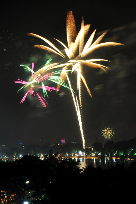 Pháo hoa được bắn lên cùng lúc từ hai điểm trên đường Đinh Tiên Hoàng và Lê Thái Tổ sáng rực bầu trời Hồ Gươm trong tiếng reo hò của hàng trăm nghìn người dân tối kỷ niệm ngày Hà Nội giải phóng.