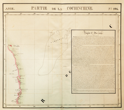 Trong bộ Atlas, bản đồ các nước châu Á gồm 11 tấm, được xếp chủ yếu trong tập hai của bộ Atlas. Việt Nam được giới thiệu thông qua các tấm bản đồ số 97, 105, 106, 110. Partie de la Cochinchine là tờ số 106, vẽ đường bờ biển miền Trung từ vĩ tuyến 12 đến vĩ tuyến 16.