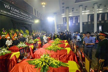 | Tổng bí thư Nguyễn Phú Trọng, nguyên Tổng bí thư Lê Khả Phiêu, Bộ trưởng quốc phòng Phùng Quang Thanh và nhiều lãnh đạo Đảng, Nhà nước, Bộ ngành, các tướng lĩnh quân đội đã có mặt từ sớm để chào từ biệt các nạn nhân. |