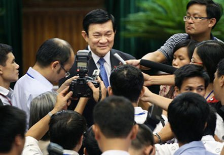 Chủ tịch nước Trương Tấn Sang trong vòng vây báo chí sau khi được Quốc hội bầu, tháng 7/2011.