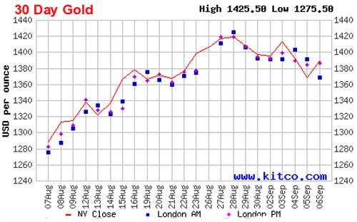 Vàng đã tăng giá trong phiên thứ Sáu khi Bộ Lao động Mỹ công bố báo cáo việc làm tháng 8 kém khả quan hơn dự kiến. Trước đó, vàng đã có vài phiên giảm giá mạnh liên tục khi các thống kê tích cực được đưa ra khiến giới đầu tư giảm kỳ vọng vào việc FED sẽ cắt giảm gói QE3 trong cuộc họp tháng 9. Với QE3, hiện mỗi tháng FED chi 85 tỷ USD để mua tài sản, theo đó hỗ trợ tăng trưởng kinh tế.