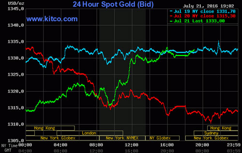 Tính tới 5h50 sáng 22/7 (giờ Việt Nam), giá vàng giao ngay tăng 1,6 USD lên 1.332,3 USD/ounce, so với mức đỉnh cao 1.376 USD/ounce ghi nhận trong tuần đầu tháng 7. Như vậy, vàng đã tăng khoảng 18 USD so với cùng giờ sáng hôm qua (trong đó có khoảng 14 USD tăng do giao dịch, còn lại do đồng USD yếu đi).