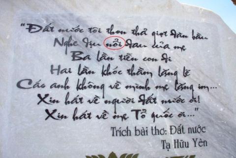 Hàng loạt bài thơ được khắc trên các phiến đá trắng trong khuôn viên Công trình Tượng đài Bà Mẹ Việt Nam Anh hùng ở tỉnh Quảng Nam bị khắc sai lỗi chính tả