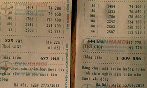 Khảo sát nhanh của VnExpress cho thấy, hoá đơn tiền điện của nhiều gia đình tại nội thành Hà Nội trong tháng 5 tăng phổ biến khoảng 30-100%. Cá biệt có những trường hợp tăng 3-4 lần.