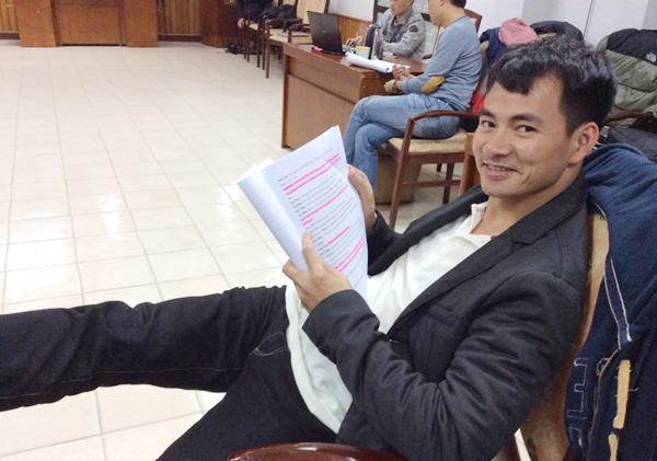 | Nghệ sĩ Xuân Bắc với cuốn kịch bản dày cộp bôi đỏ chi chít. |