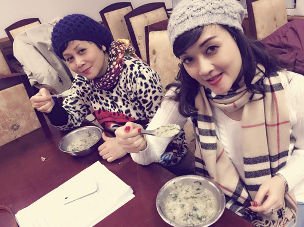 ![]() Nghệ sĩ Quang Thắng, Minh Hằng, Vân Dung thưởng thức món cháo chim do fan tặng. |